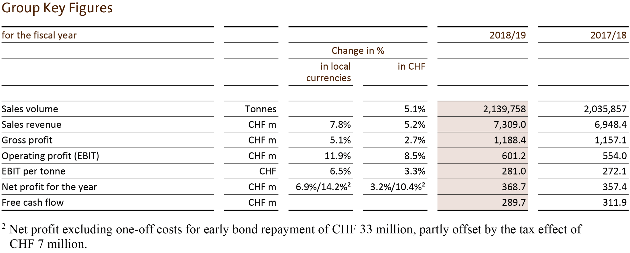 2 Net profit excluding one-off costs for early bond repayment of CHF 33 million, partly offset by the tax effect of CHF 7 million.