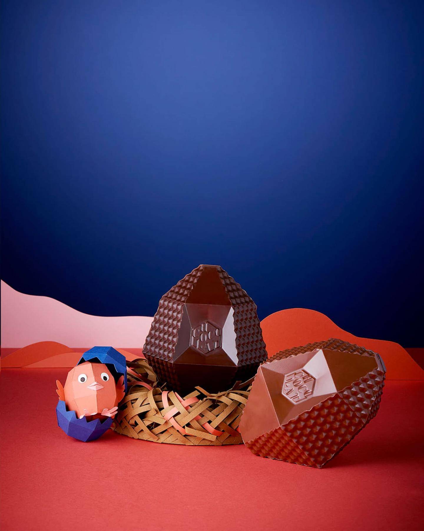 Alain Ducasse Œuf Facetté Chocolat Noir 75% & Lait 45% Praliné Amande & NoisetteThese Easter eggs by Chef Alain Ducasse are sculpted on one side with a multitude of hexagons and adorned on the other with our embossed signature. An exceptional creation with almond-hazelnut praline and an inimitable texture. One side is milk, and one side is dark chocolate.