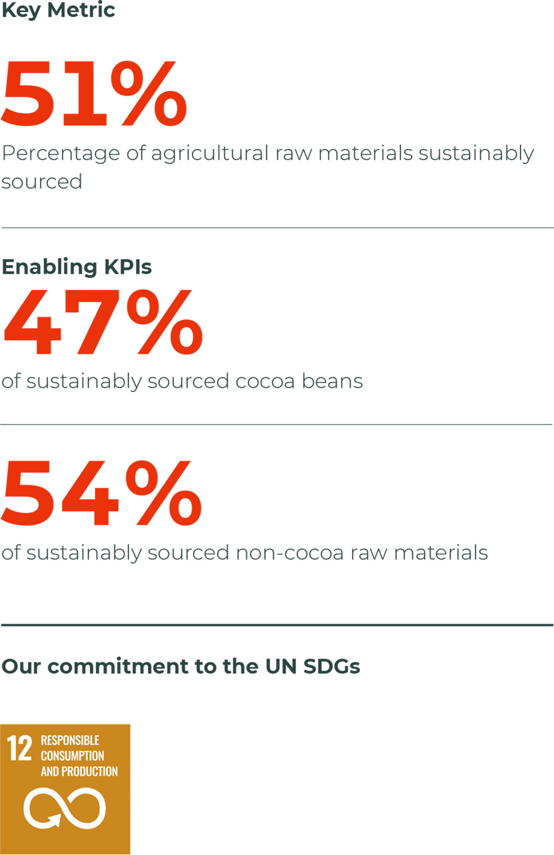 51% of all the raw materials we source originate from sustainable sources. This is an increase of almost +16% compared to the previous fiscal year. In 2018/19 we increased our volume of sustainably sourced cocoa to 47%. In the coming fiscal year we will start to focus more efforts on further building the market pull for sustainably sourced cocoa. 54% of our non-cocoa ingredients are now coming from sustainable sources, an increase of almost +23% compared to 2017/18.