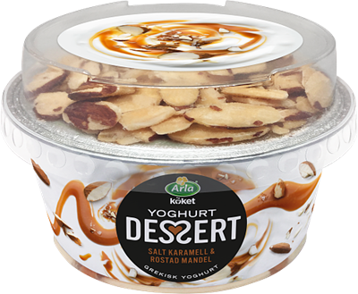 Arla yoghurt dessert with salted caramel sauce and roasted almonds