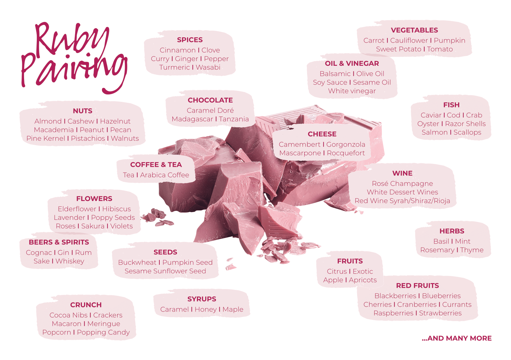 Ruby chocolate’s fruity taste calls for bold and unusual food pairings. But pay close attention when working with ruby chocolate to ensure the chocolate keeps its original flavor and color.